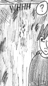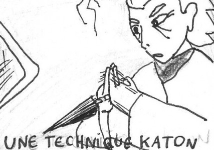 En plein milieu d'un combat, Atakame va se manger une technique Katon à bout portant (aïe). Il compose donc le signe adéquat.